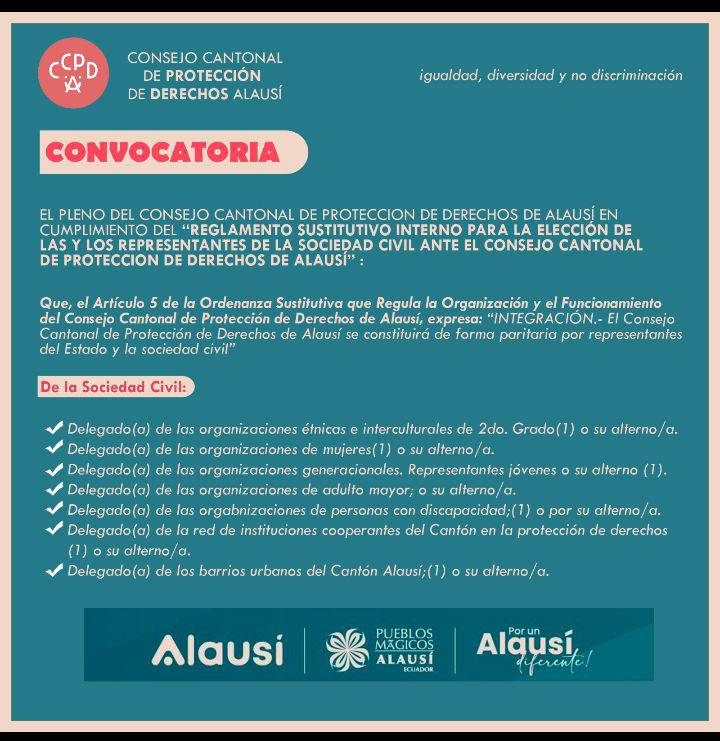 El Consejo Cantonal de Protección de Derechos de Alausí, en cumplimiento de la Ordenanza Sustitutiva que regula la Organización y el Funcionamiento del CCPD-A, convoca públicamente a la continuidad del Proceso de Elección de los Miembros de la...