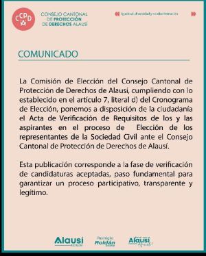 El Consejo Cantonal de Protección de Derechos de Alausí, en cumplimiento del Reglamento Sustitutivo Interno para la Elección de las y los Representantes de la Sociedad Civil.
