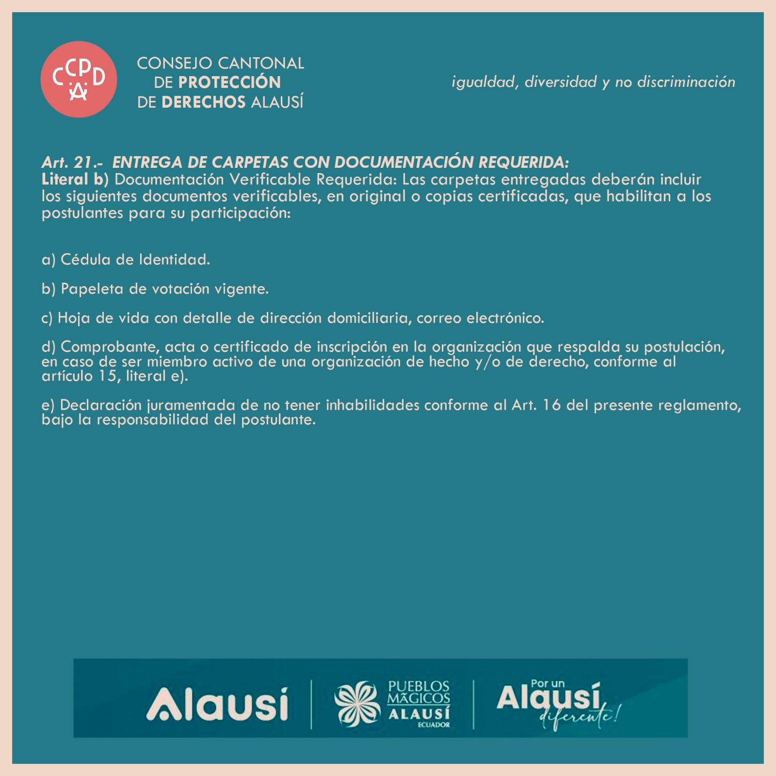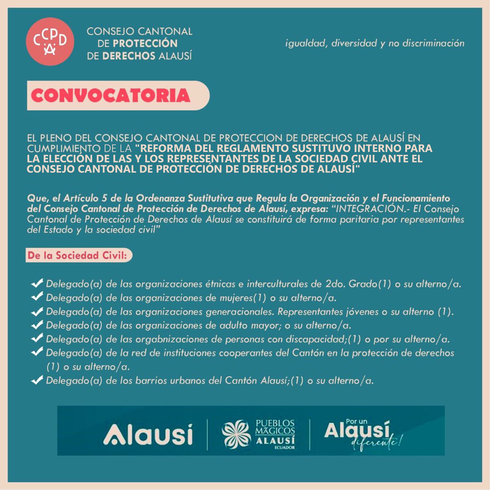 El Consejo Cantonal de Protección de Derechos de Alausí, en cumplimiento del Reglamento Sustitutivo Interno para la Elección de las y los Representantes de la Sociedad Civil.