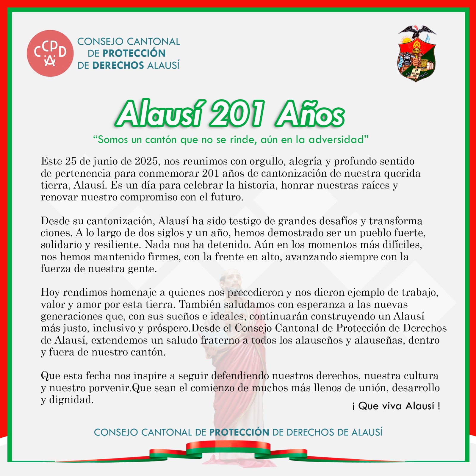 En cumplimiento con lo establecido en la Ley Orgánica de Participación Ciudadana (LOPC) y la Ley Orgánica de Transparencia y Acceso a la Información Pública, el Consejo Cantonal de Protección de Derechos de Alausì, INVITA a la ciudadanía al in...
